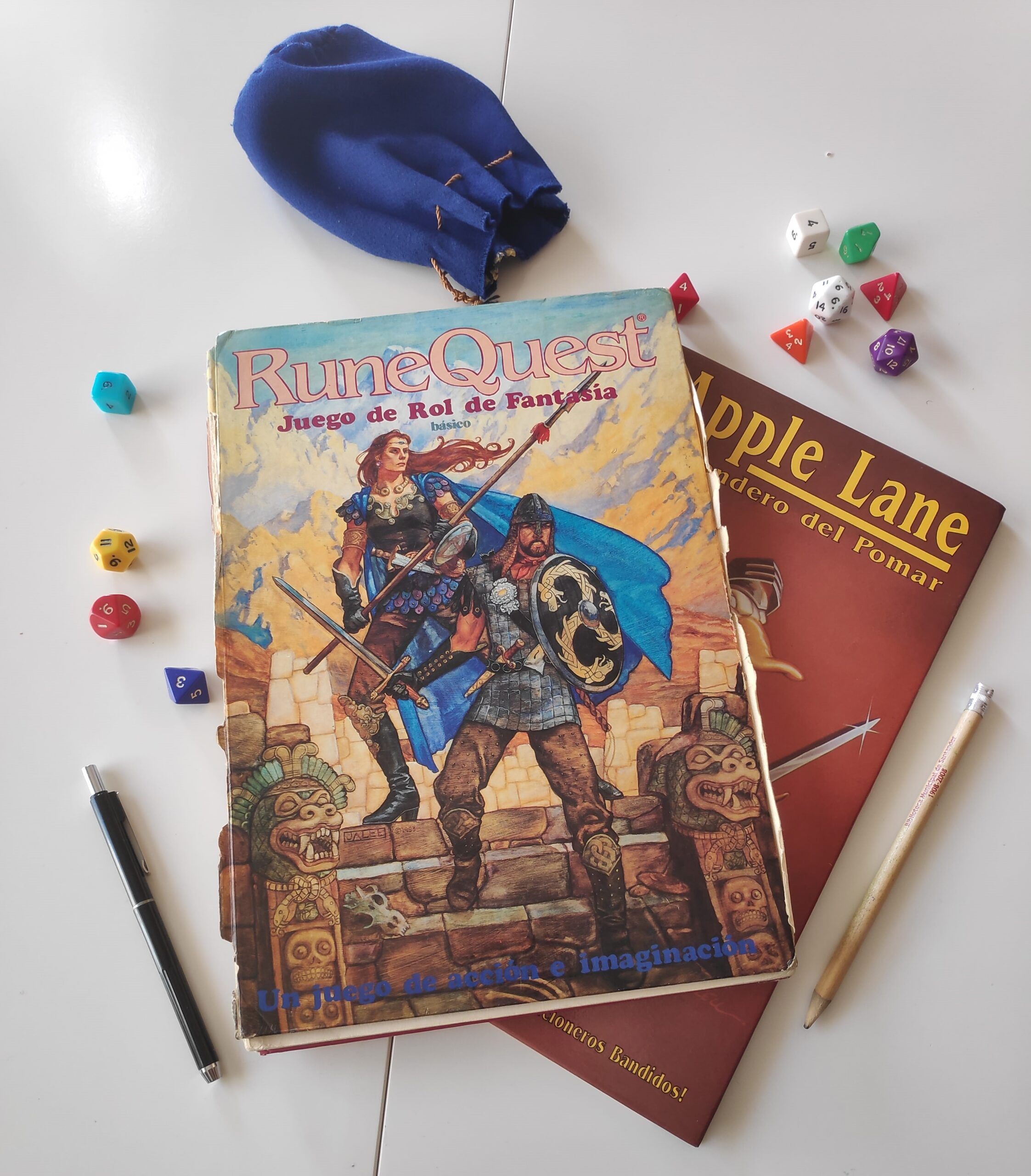 Yo volví para mi casa, le di varias vueltas durante un par de días y de nuevo me planté en la juguetería. Compré este manual básico de Rune Quest (se ve lo hecho polvo que está ¿no?, tiene más de 30 años, jejeje), junto con el de La llamada de Cthulhu y un módulo de D&D 🙂
